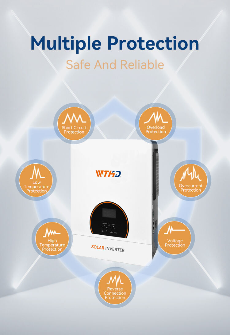 WTHD 3KW inverter uchun ham chidamlilik va xavfsizlik ustuvor ahamiyatga ega. Bu tizim xavfsiz va ishonchli saqlab qolish uchun ortiqcha yuklanish himoya, qisqa uzilish himoya va past kuchlanishni uzish kabi ko'p himoya xususiyatlarini o'z ichiga oladi